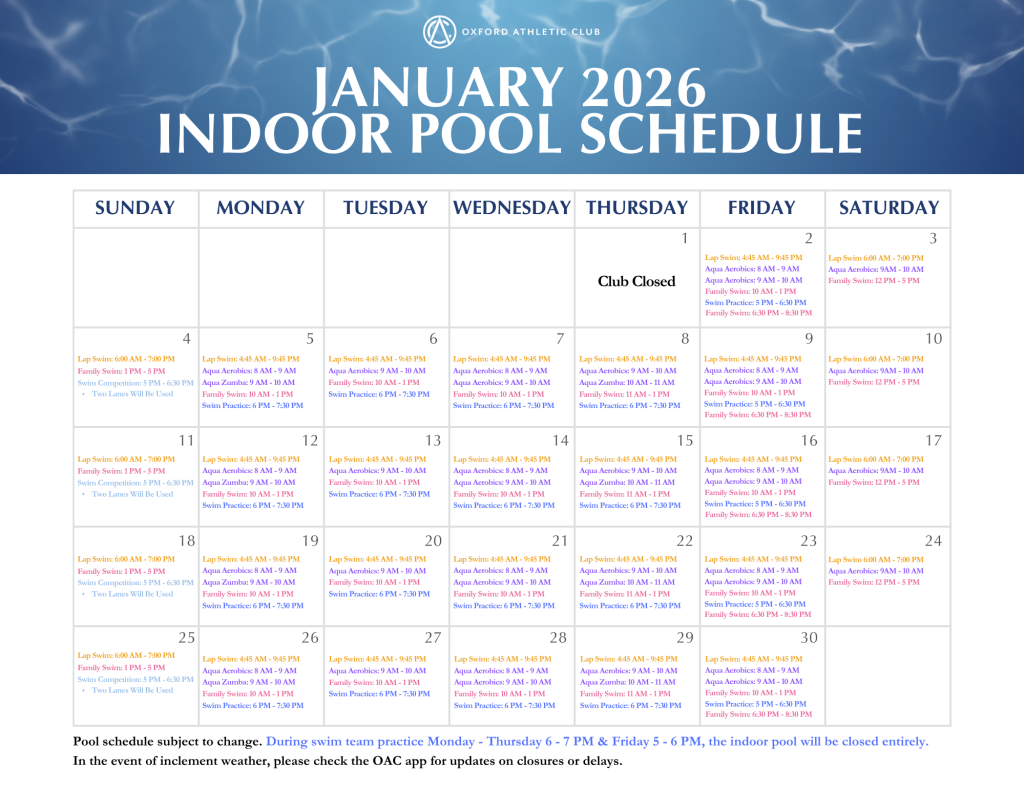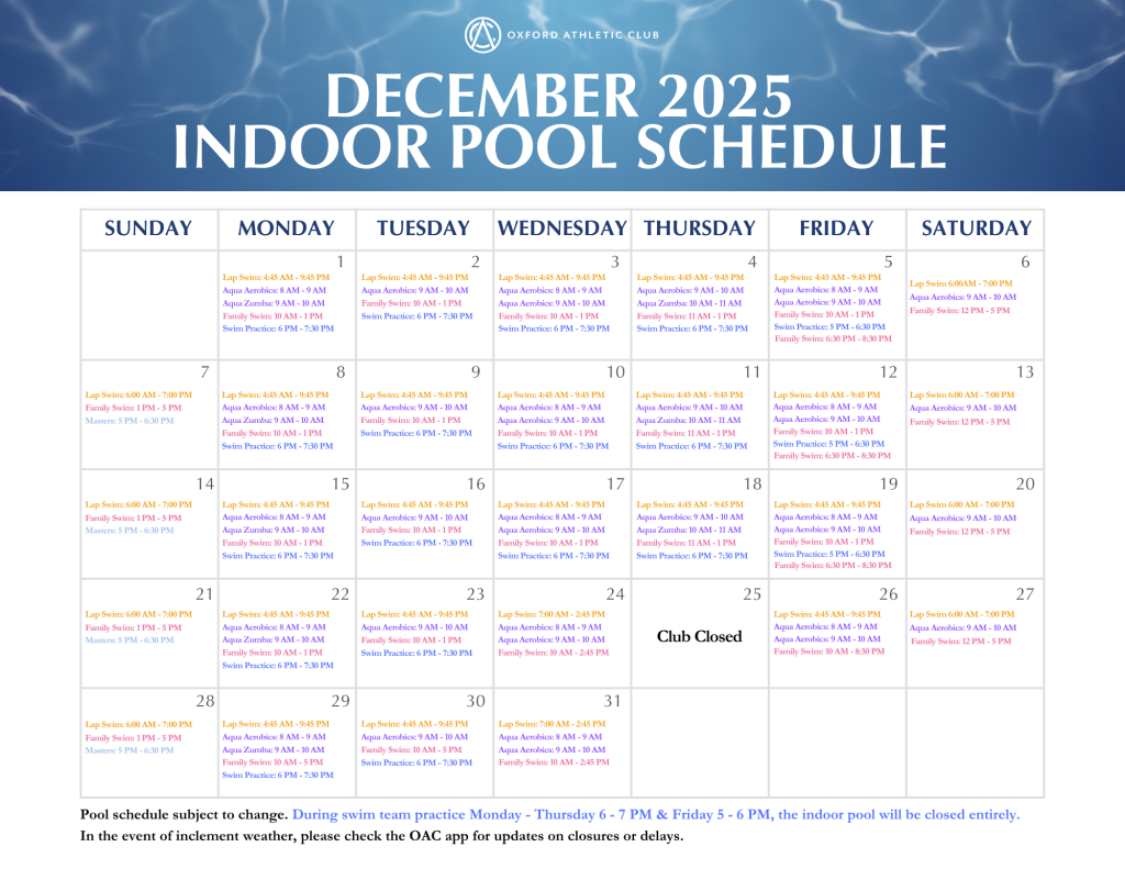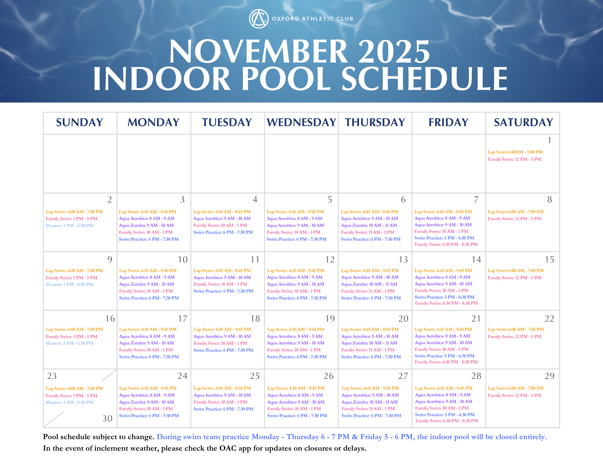 OAC Members enjoy year-round access to both our indoor and outdoor pools, each featuring 6-lane layouts for a range of aquatic activities. Maintained at a comfortable 82 degrees, you can dive in during winter or relax under the summer sun. With family swim hours, aquatic fitness classes, and private lessons available, our pools are designed for every member’s needs. The indoor pool’s extended lap swim hours ensure uninterrupted exercise, while the 104-degree whirlpool is ideal for unwinding post-workout. Outside, families also enjoy the splash pad, zero-depth baby pool, and jungle gym, making OAC pools the ultimate fitness and fun destination all year long.