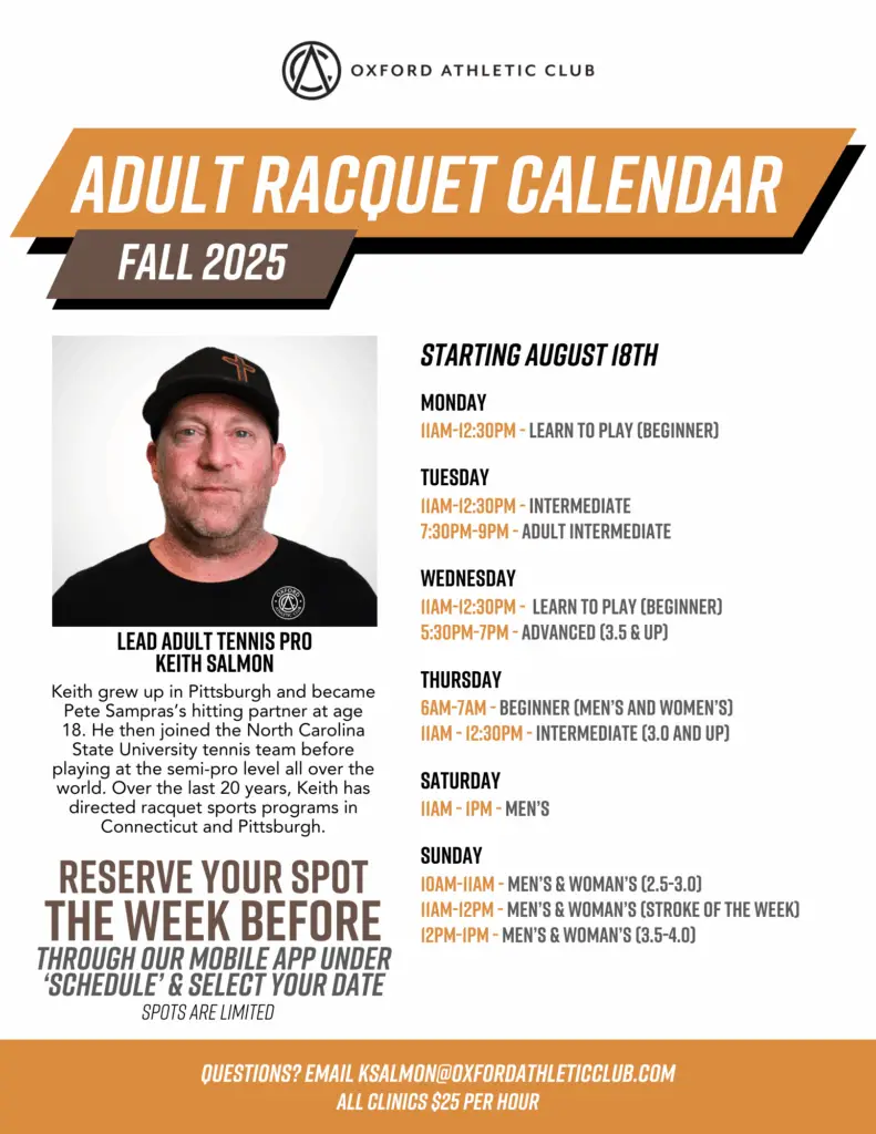 At Oxford Athletic Club, our tennis programs are designed for players of all levels to improve their game in a fun and engaging environment. Whether you are just starting out or perfecting advanced techniques, we offer private lessons, group clinics, and specialized coaching to meet your needs.