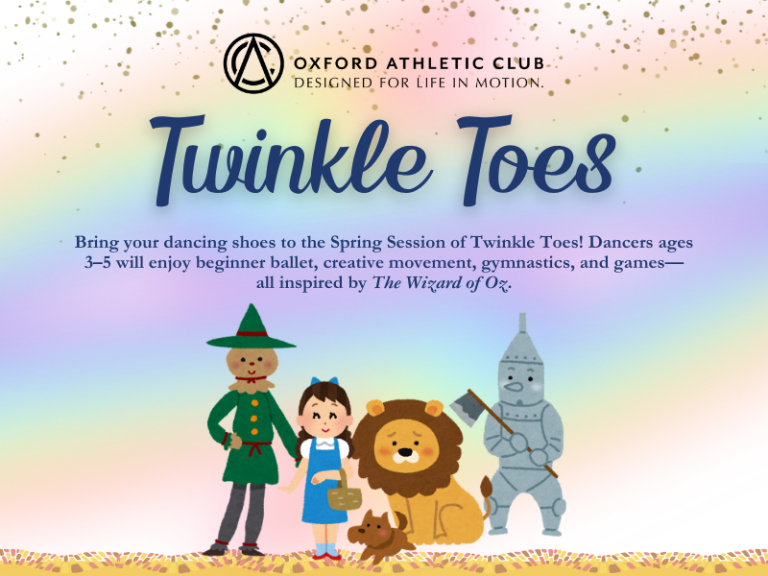 Bring your dancing shoes to the Spring Session of Twinkle Toes! Dancers ages 3–5 will enjoy beginner ballet, creative movement, gymnastics, and games – all inspired by The Wizard of Oz.